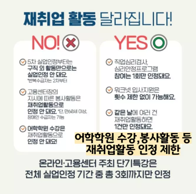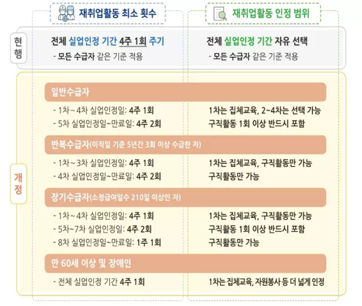 재취업활동의 방식과 횟수, 수급자별 인정방식 등 변경되는 내용들이 있으니 사진 참고하시면 됩니다.